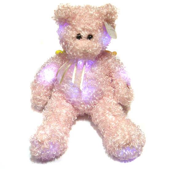 This is a glowing teddy soft toy which can light up in 7 colours by squeezing the left paw. It is made of plush, which is a kind of velvet.