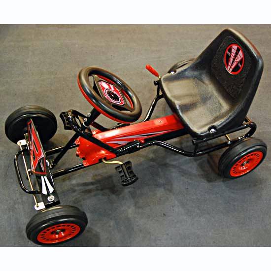 Shown here is a go-kart that is made of metal and plastic. This four-wheel go-kart has a sturdy metal frame, making it safe for children. This go-kart is good for muscle training.