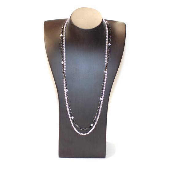 These necklaces feature golds and diamonds on their chains. They are in black and white, respectively. The black one comes with eye-catching small diamonds equally spaced away from each other. The faceted diamonds on both pieces have surfaces that can reflect the maximal amount of lights, making them look sparkling.