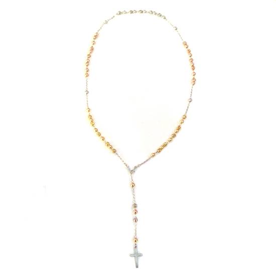 This necklace presents a gold-and-silver colour combination. Along the silver chain are numerous golden beads, divided into several clusters. Beads are also found on the drop, where a cross is hung at the end. Such a gold-and-silver colour combination can match with almost all colours nicely.