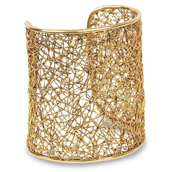 This is a gold bangle for ladies and women. The wide open bangle has an exquisite filigree design made with twisted gold wires, creating a web-like feature which is great for matching fashion clothing and party wear.