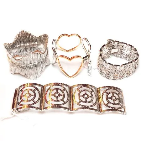 These bangles feature special outlooks. Each of the four bangles presents a unique pattern, one of which consists of four hollow hearts in golden and silver colours. Another one looks more like a crown for a queen. The other two look more complicated, as they both present more detailed patterns, such as sparkling flowers and circles.