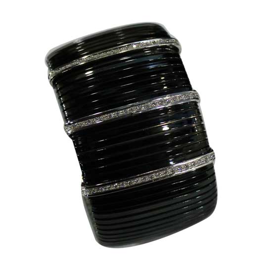 Displayed is a bangle that showcases a diva style with volume. The bangle features accents of diamonds and white gold for a touch of elegance. Get the attention you are looking for with this chic bangle.