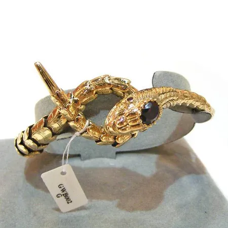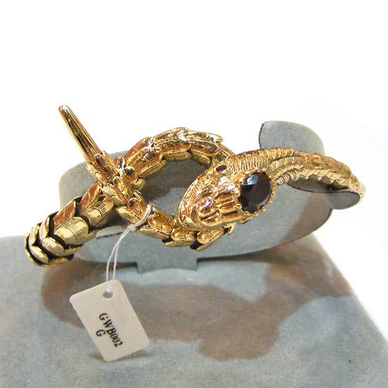 This is a gold bangle in a snake design. It is made of 9K yellow gold with a garnet stone. The garnet stone is plain polished and non faceted for a simple yet smooth outlook.
