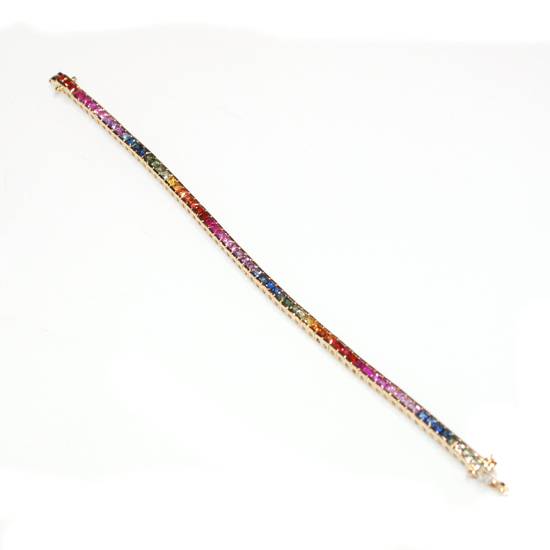 This is a gold bracelet set with sapphires. The prong-set faceted sapphires are in grauated colours of a rainbow. The eye-catching colourful bracelet matches different outfits.