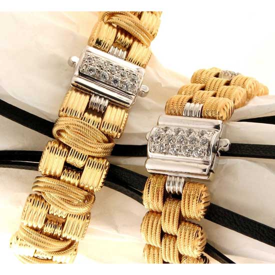 This is a gold bracelet with a structure of wire gold to exude a glamorous sense. The buckle is decorated with petite CZ stones for a more sophisticated look. This gold bracelet is a pricey accessory to pair with formal dresses.