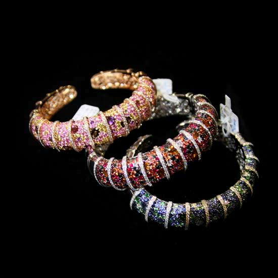 This ladies' bangle draws you in with its unique exotic design. The white gold and pink gold bangle is dressed up by multi-color precious stones for a sparkling touch. This beautiful gold bangle is certainly the one to admire.