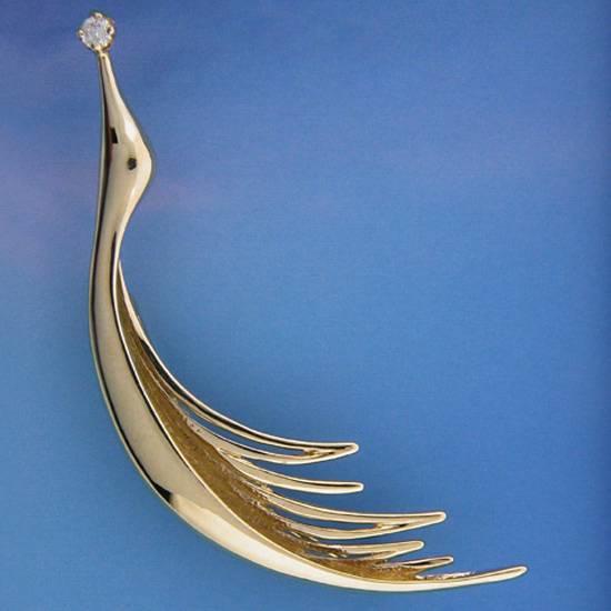 This is a gold brooch resembling an angel's wing. Featuring a round diamond on the top, the openwork wing presents an elegant look and refined ambiance, which makes it a high-fashioned piece of jewellery for ladies and women.