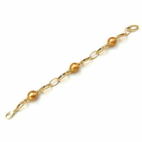 This is a gold chain bracelet with pearls that is made out of 14K gold. Different to usual chain bracelets, the oval links are of alternating polished and milgrain finishes. Accented with 3 near round pearls, this gold bracelet is a great gift to show that special someone that you care.