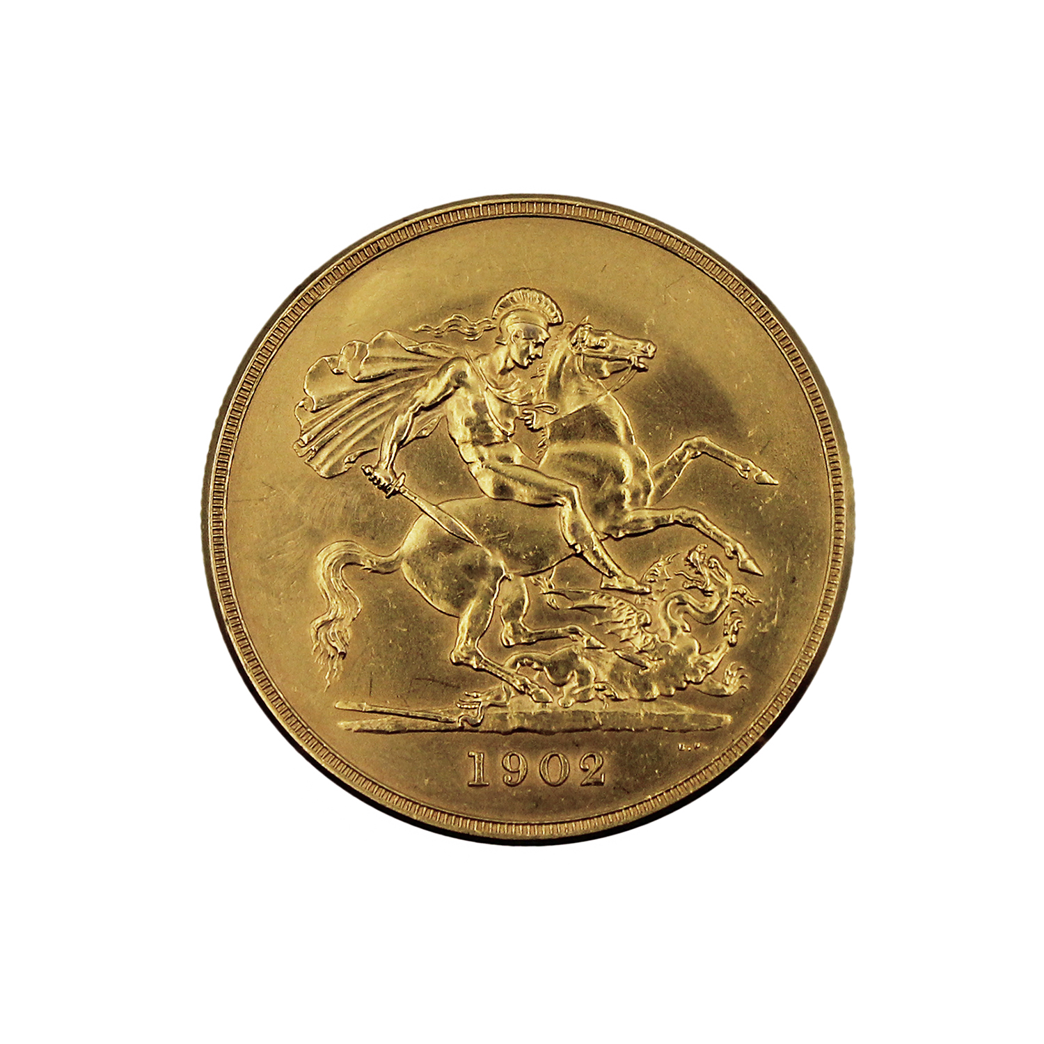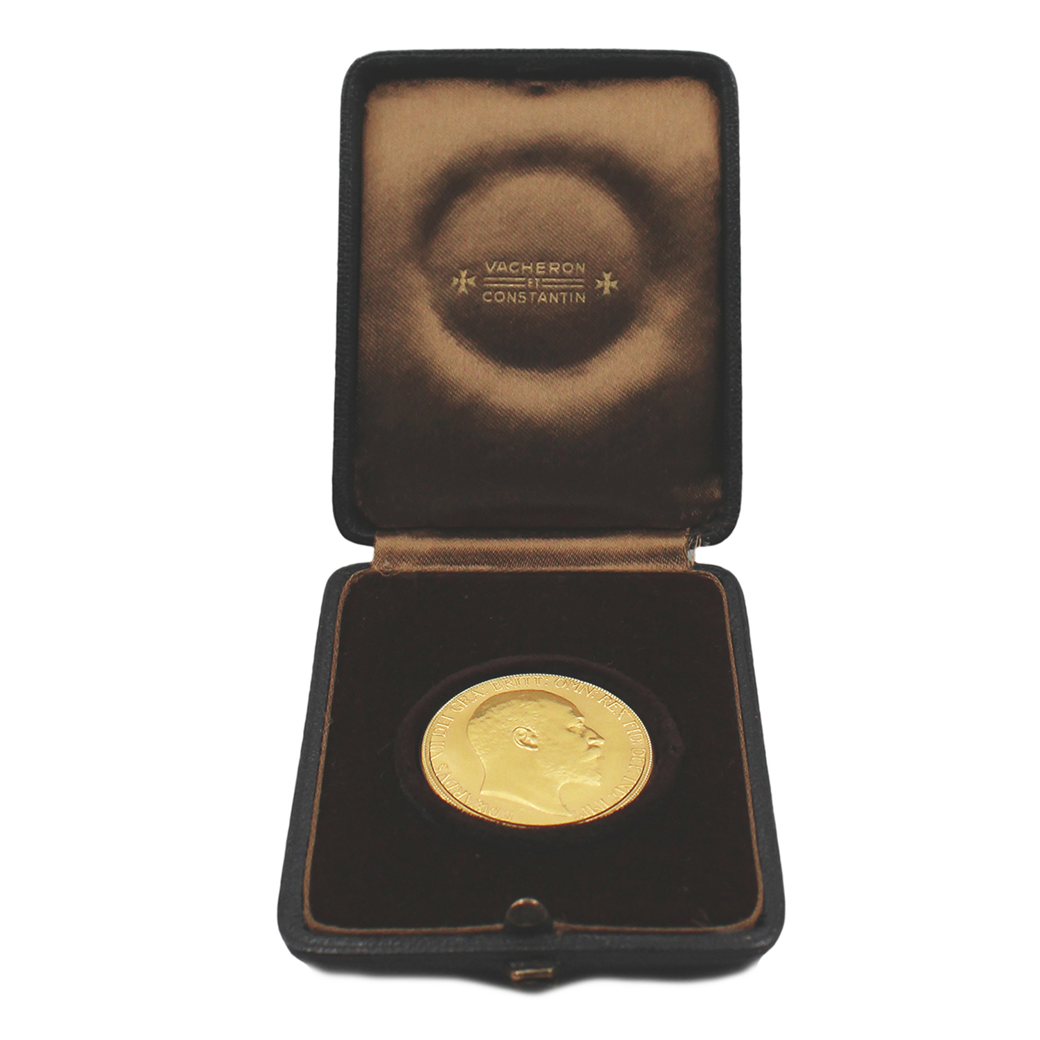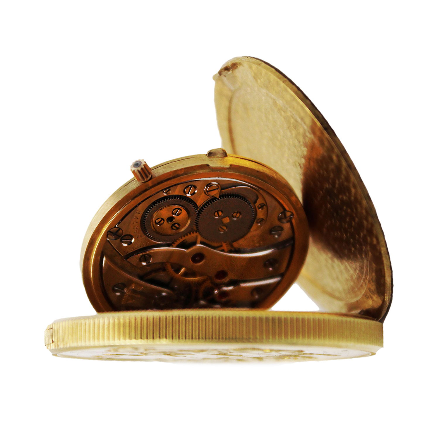 Case: Round, 18k yellow gold case no. 264432 measures 36mm, weighs approx. 38g, and features snap-on case-back hinged within a 18k gold coin dated 1902.