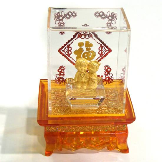 As shown is a gold decoration designed as a pair of gold couple coming with a glass container. Made of 24K gold, this gold decoration is best for gift for the couples.