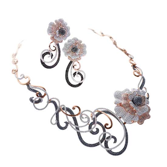 The pair of earrings and necklace feature a luxurious blend of 18k white and rose gold. They are decorated with stunning blossom embellishments finished with great attention to details. The pieces of jewelry are also set with dazzling diamonds in black, brown and white.