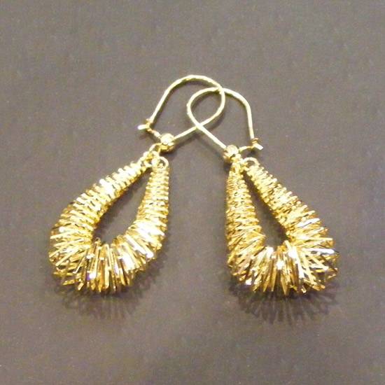 This is a pair of gold earrings. The jewellery earrings are decorated with a bunch of gold filaments in the shape of squares. The square filaments will swings beautifully when you move your body.