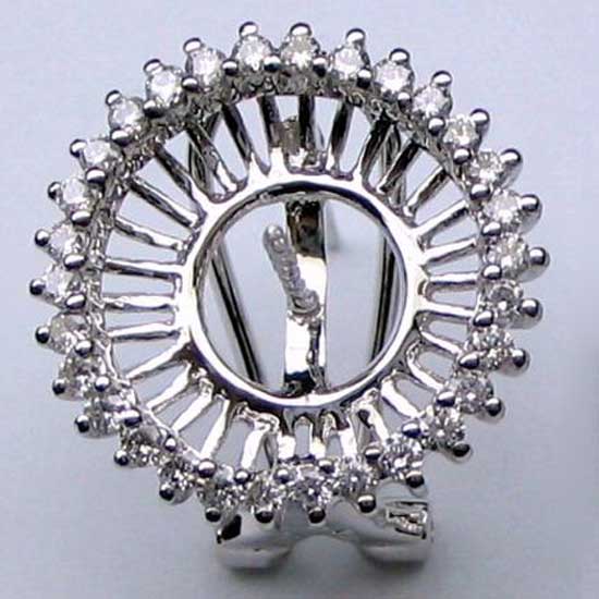 This gold earring base features a round base for a pearl in a large size. The base embraces the pearl with prong-set sparkling diamonds on the edge. The simple design makes a remarkable match with different types of pearl.
