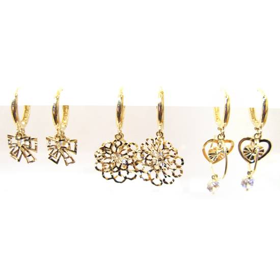 These are three pairs of gold drop earrings set with cubic zirconia stones. The pairs have danglings in openwork designs of ribbon bows, flowers and hearts respectively, which are decorated with one or two colourless cz stones to add a glittering effect.