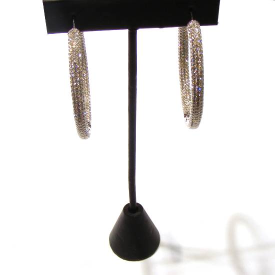 This pair of hoop earrings looks simple, but the design is much more than it shows. Each piece is a perfect circle, the rim of which is fully decorated with white diamonds. The diamonds are all faceted, so that they reflect lights very well, and hence, the shiny image.