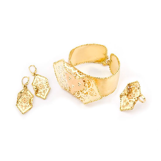 This 18kt gold collection is inspired by the lace of Burano (Venice). The collection is available in satin and bright finishes, 14, 18 and 21kt gold in different gold colors. The full set contains a necklace, a bangle, a pair of earrings and a ring.