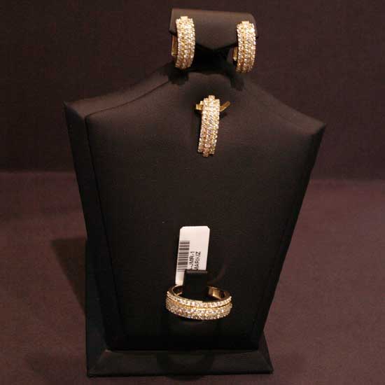 Featured here is a gold jewelry set including a pair of earrings, a ring and a pendant in a classic and retro look. The shiny and glamorous gold accessory exudes a sense of elegance from its uniqueness. This set of gold jewelry is perfect for matching with your party dresses.