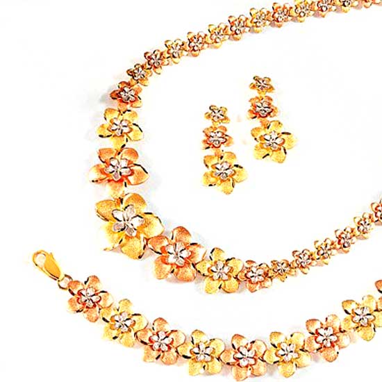 The luxurious jewelry set includes a necklace, a bracelet and a pair of earrings. Each jewelry item is finely executed in an elegant floral setting. The shiny gold delivers a touch of glamor. The fine jewelry set is ideal for enhancing your grand ensemble.
