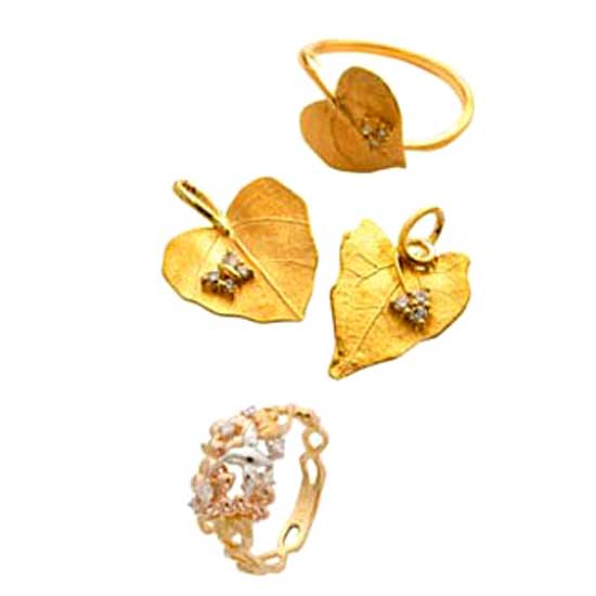 This ravishing gold jewelry set comes with a pair of earrings and a ring, featuring leaf figures of different designs. The veins are vividly portrayed in the leaf charm, with several glittering stones to resemble the attachment of a butterfly. The gold jewelry set is shimmering with a sense of affectionate sentiment.