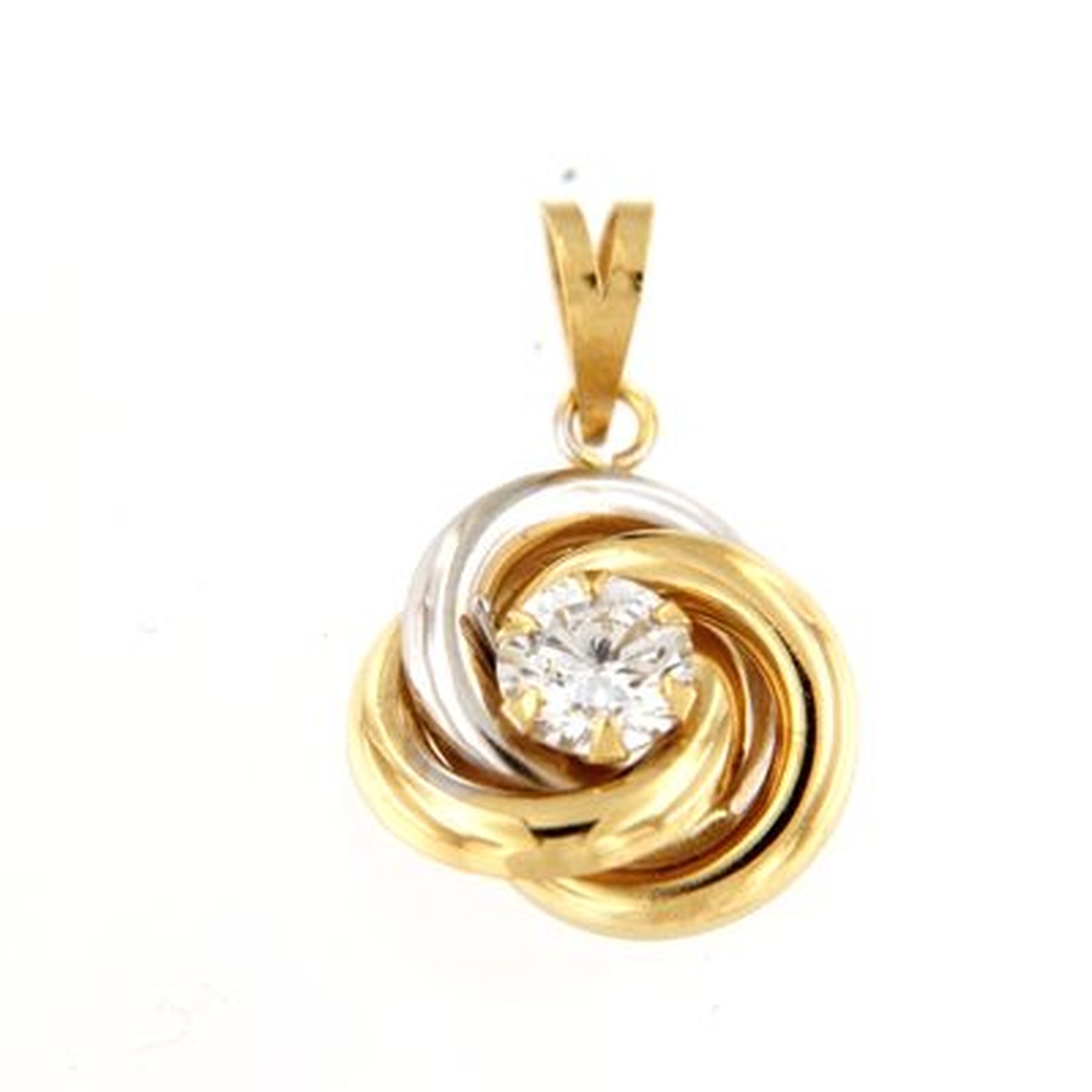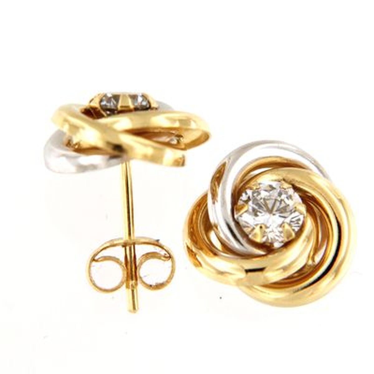 Elegant two-tone gold stud earrings and pendant crafted in polished yellow and white gold, featuring an intertwined swirl design that symbolizes harmony and balance. At the center, a brilliant-cut cubic zirconia adds a refined sparkle, enhancing the sophisticated contrast of the gold tones. A timeless and versatile piece, perfect for both everyday elegance and special occasions.