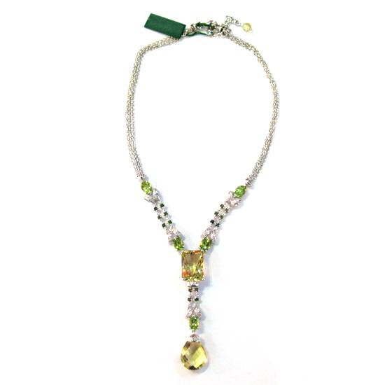 This necklace features many faceted gemstones. Their surfaces can reflect the maximal amount of lights. Therefore, they can display very sparkling images. The gemstones include lemon quartz, white diamonds etc. At the drop is a pear-shaped stone in light colour. Some other smaller stones are found at the drop and on the chain as well.