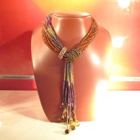 The multi-strand nature might be the first thing catching your attention. The tangling strands, shining beautifully with diamonds, are tied together with a piece of gold. The end of the strands is a fringe, with gemstones hung as the drop. The strands also present several colours, from purple, yellow to orange.