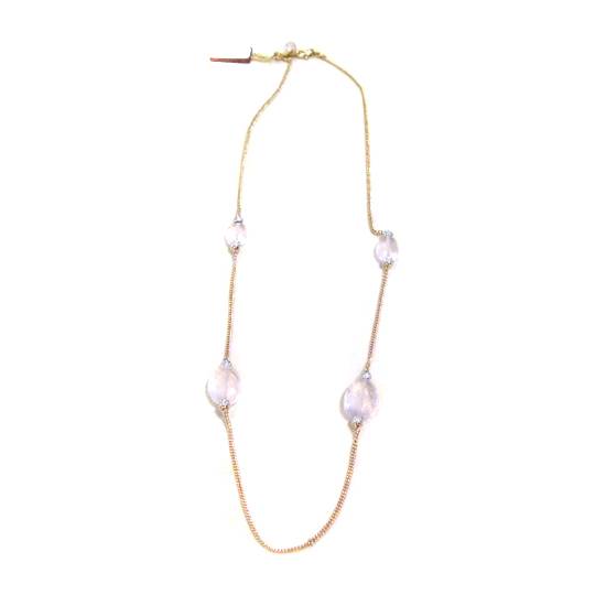 This necklace is made in 18K gold with rose quartz. The length of the necklace is 72cm and the weight is 30grams. The rose quartz enhance the elegance of the necklace with its simple design.