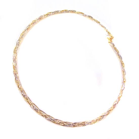 This necklace displays an image in which four golden strings tangle with each other. Despite that, the necklace looks organized and neat, without any disorderly tangling. The whole necklace mainly bears a golden colour, but along the chain, slightly silver colour seems to be found, creating an even more elegant picture.