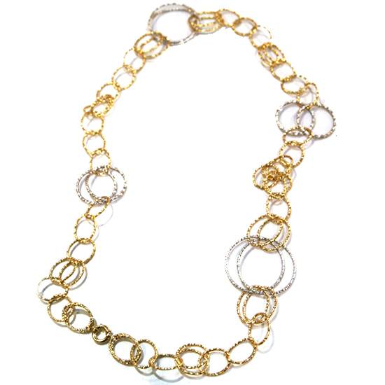 This is a gold necklace. It has a double link pattern with rings interlocking to form the whole chain. There are white gold and yellow gold rings, while the majority is yellow gold rings. This necklace is very light as it is made of hollow gold.