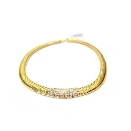 This gold necklace has loose diamonds embedded in its front. The exquisite necklace has a well-polish surface. The well-designed necklace is a great addition to your jewelry collection.
