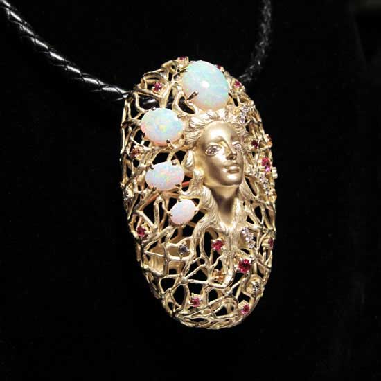 - Material: 18K yellow gold, opal, diamond and ruby.