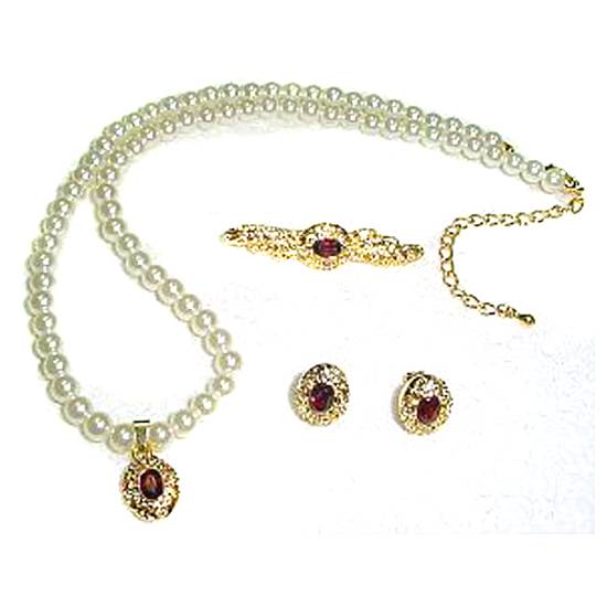 This is a gold plated jewellery set of a pair of earrings, a brooch and a necklace. The whole set shares the same design featuring oval red stone cabs decorated with white sparkling stones. It comes with a delicate packaging box.