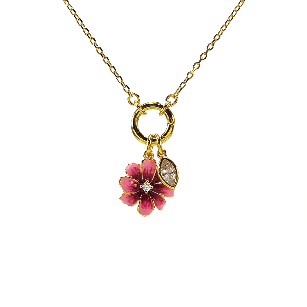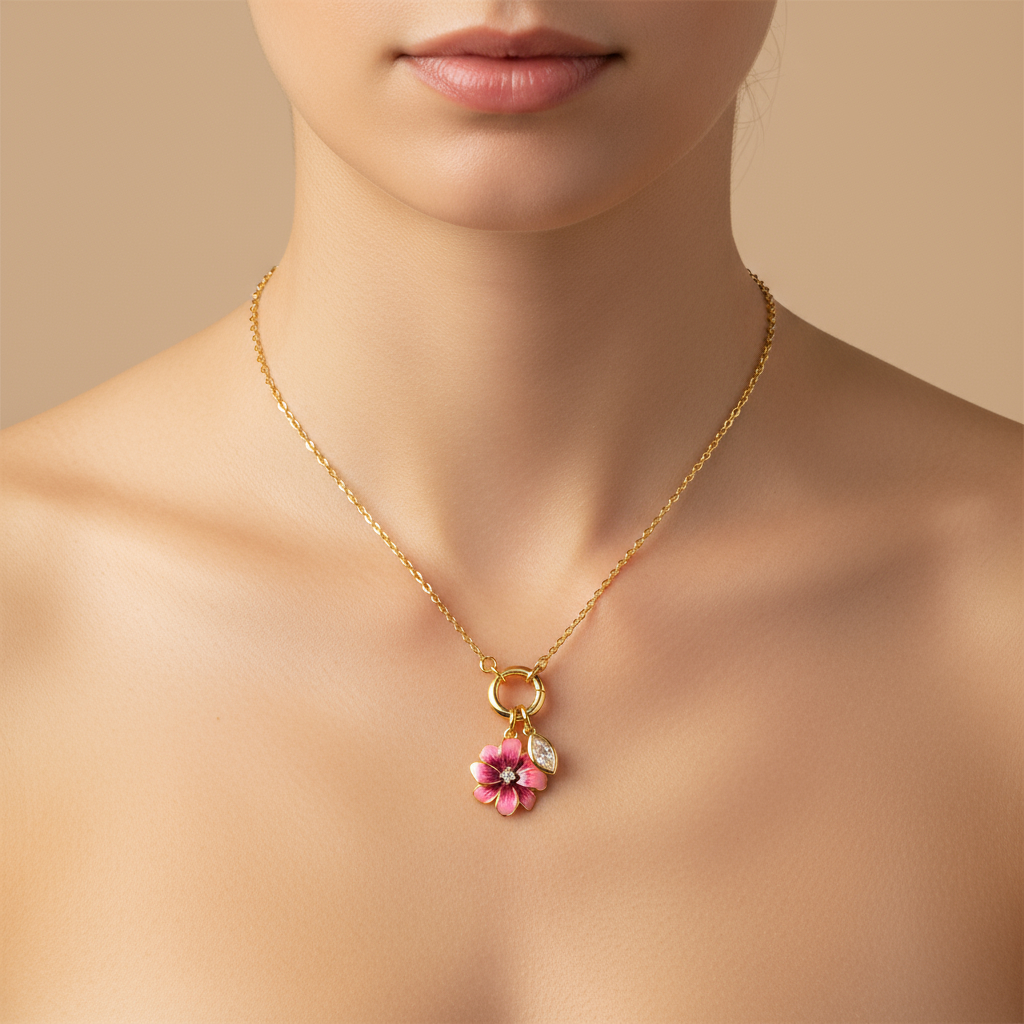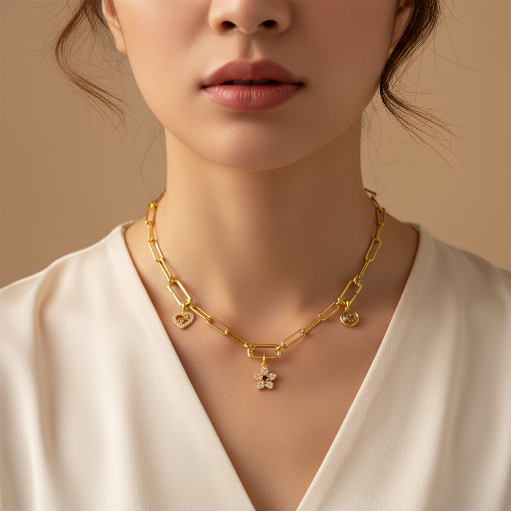 This elegant necklace features a delicate, interconnected gold plated silver chain adorned with three distinct and beautifully crafted charm pendants. Each charm hangs at a varied length, creating a dynamic and graceful silhouette. The first charm is a heart-shaped pendant, embellished with sparkling stones and featuring two delicate star cutouts. Centered is a flower-shaped pendant, showcasing a vibrant red gemstone at its core, surrounded by a halo of smaller clear stones. Completing the set is a circular pendant with an intricate floral design, richly encrusted with an array of colorful stones.