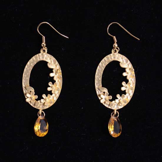 The ravishing ladies' earrings showcase a dangling design crafted with top-grade silver. The oval-shaped floral pendants are adorned by lustrous teardrop-shaped stones for brilliant radiance. Striving for perfection, these stunning silver earrings are plated with gold for a glow of bewitching shine.