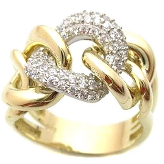 This ring shows an interlocking pattern of several circles. Its shoulders are two bent circles that hold tightly on the shank. The setting is a CZ stone, which is also firmly locked by the two pieces of gold next to it.