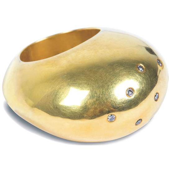 This is a dome-shaped gold ring for ladies and women. Several round and white glittering stones are bezel set on the dome top of the ring to break its heavy and thick appearance, and add a sparkling look to it at the same time.