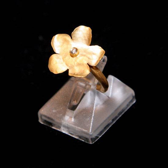 This ring shows a clear flower pattern on its setting. The first impression the ring gives out is the fragility of the flower, the petals of which seem to be bent a little bit, creating an image of a weak flower urging for protection. The middle of the flower is a faceted stone, presenting a sparkling image.