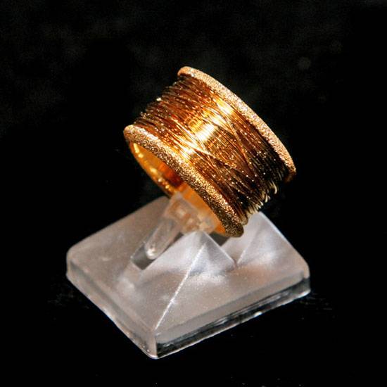 This ring is the most renowned item of the company. The surface of the shank features seemingly tangling golden lines, which reflect lights excellently. Along the rims are shining gold, which highlights the circular shape of the ring. The golden colour indicates that it is an elegant piece of jewellery.