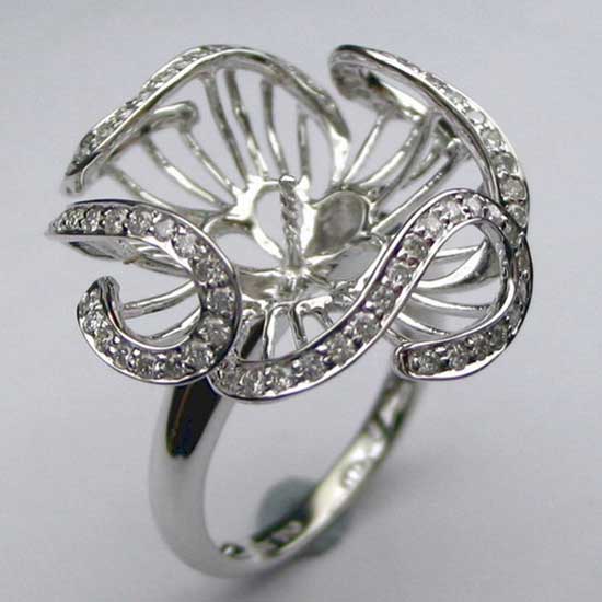 This is a 18K gold ring setting featuring a flower-shape base. Dazzling diamonds are set on the base to complement the centered pearl. Brilliant craftsmanship is shown in this setting to match with different types of pearls.