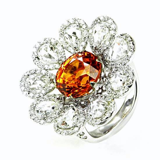 This gold ring features embellishment of rose-shaped diamond and yellow sapphire. The ring is finely crafted into a shape of a blossom that shows high-quality craftsmanship. It is designed to impress your loved one.