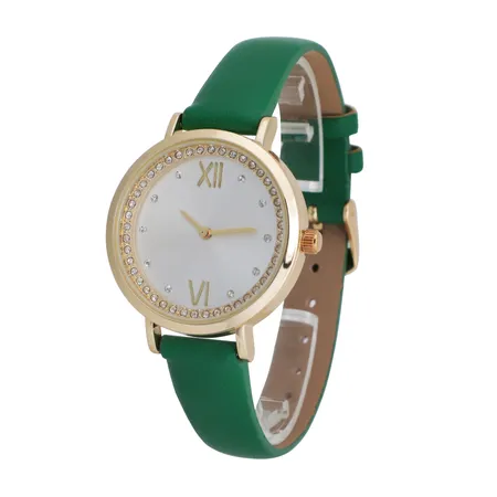 Gold tone watch with forest green strap