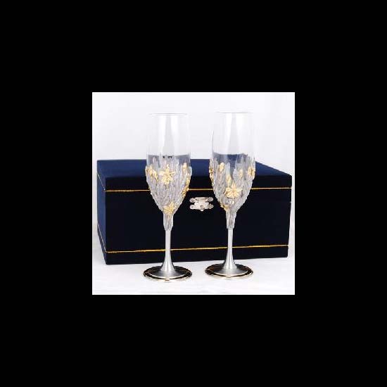 • The glass champagne goblets are adorned with golden decorations and gold plated pewter bases