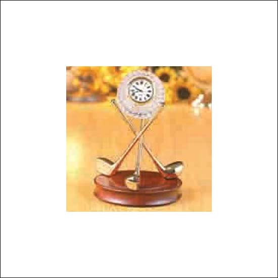 • Three golf clubcs holding the crystal clock on a wooden stand