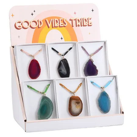 This stunning necklace box set showcases a unique agate slice centerpiece, celebrated for its mesmerizing natural patterns. Each slice is one-of-a-kind, making this a truly personal gift. Presented beautifully, it's an earthy yet elegant statement of individual style.