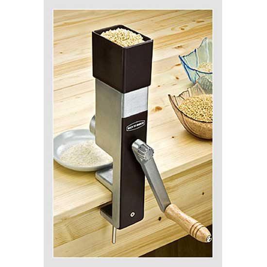 The manual-operated grain mill grinds wheat, corn, rice, oat, barley, non-oily seeds, and various spices. The grinding level is adjustable from fine to coarse textures. It is attached to the corner of the table for safety operation.