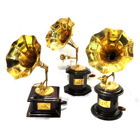 The handsome decoration is a miniature and the replica of old playable gramophones. The brass construction offers high durability, while the wooden base bestows a sophisticated touch. This brilliant gramophone makes a great decorative piece.