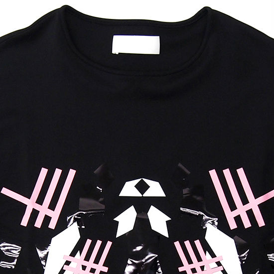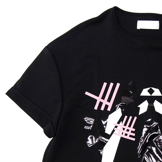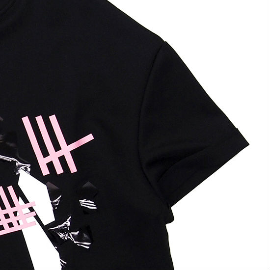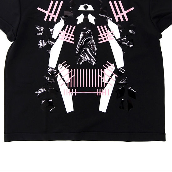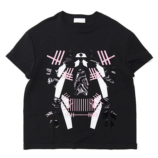 Update your casual look with a striking T-shirt as showcased. Stylish yet symmetric in appearance, the black T-shirt is delicately crafted with graphic prints with contrasting accents in pink and white. Topping off the design with a hint of textural contrast, the T-shirt features tonal embellishments in a glossy finish.