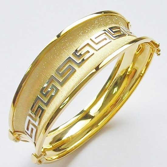 This is a Greek key bangle with a satin and polished surface. It is manufactured with tubing and plating gold material. This bangle is also made with excellent craftsmanship and attention to detail.