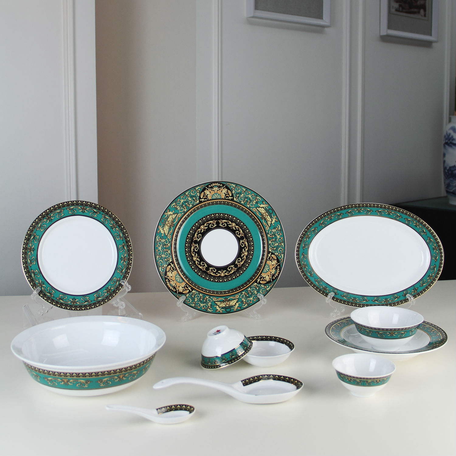 - Green gold rich ceramic tableware.